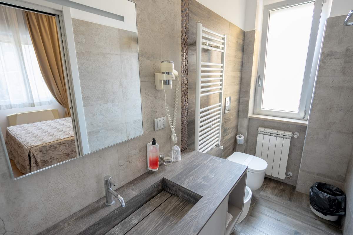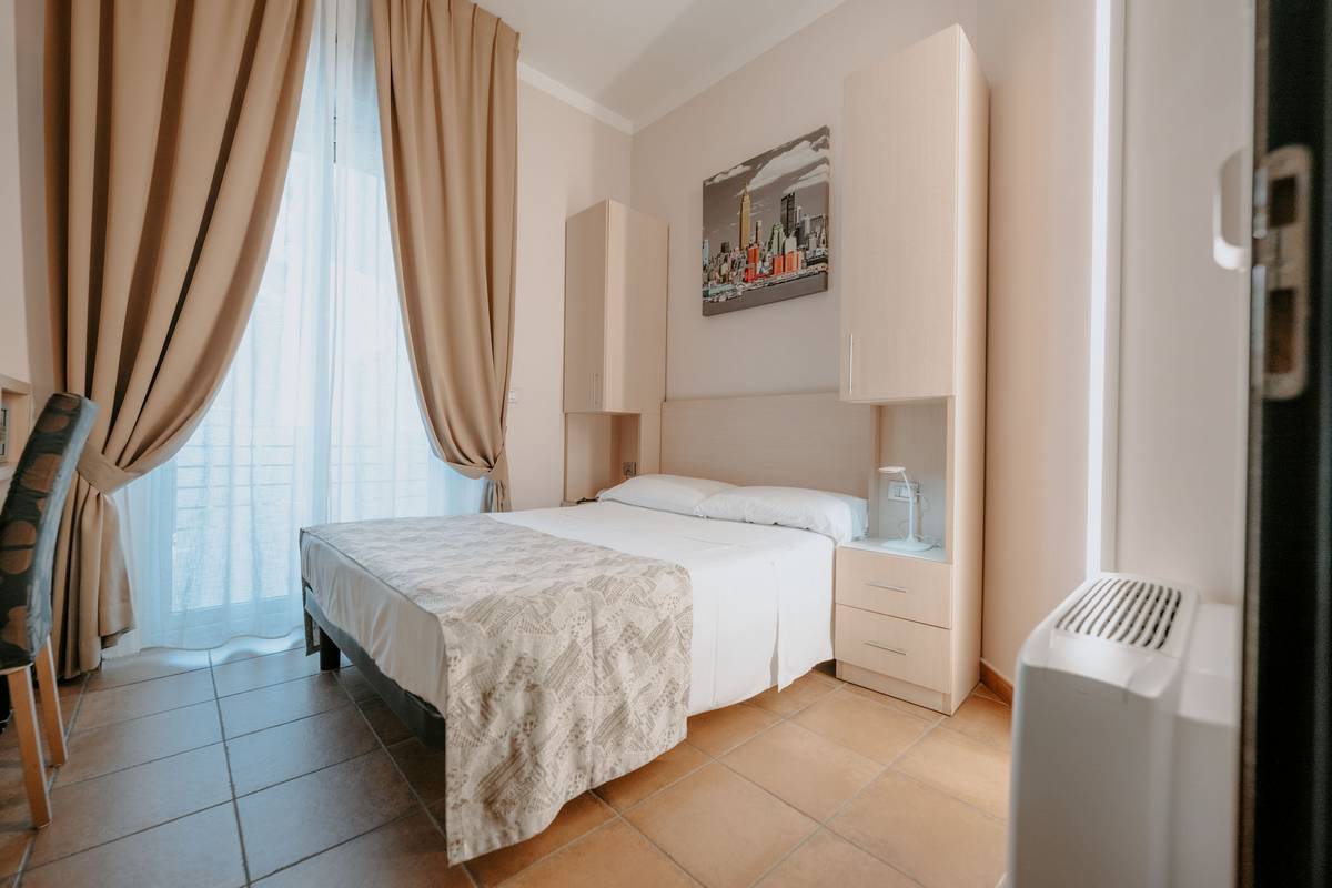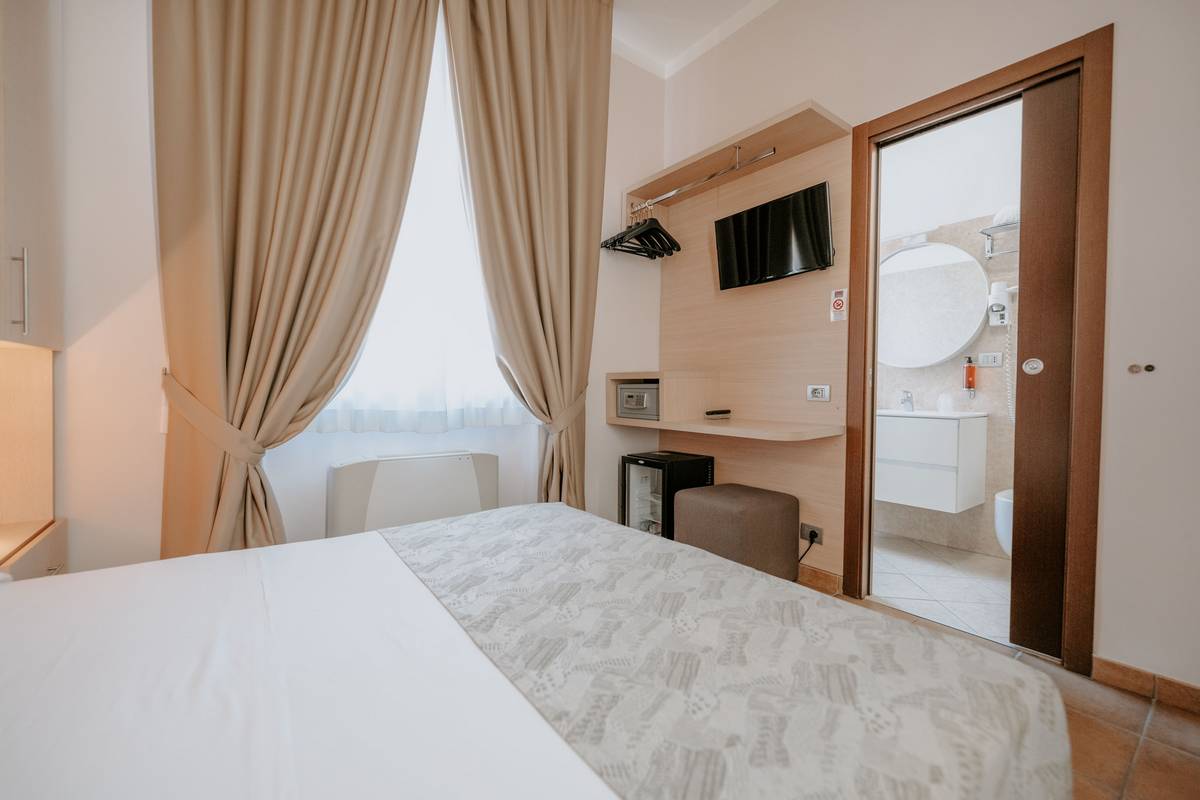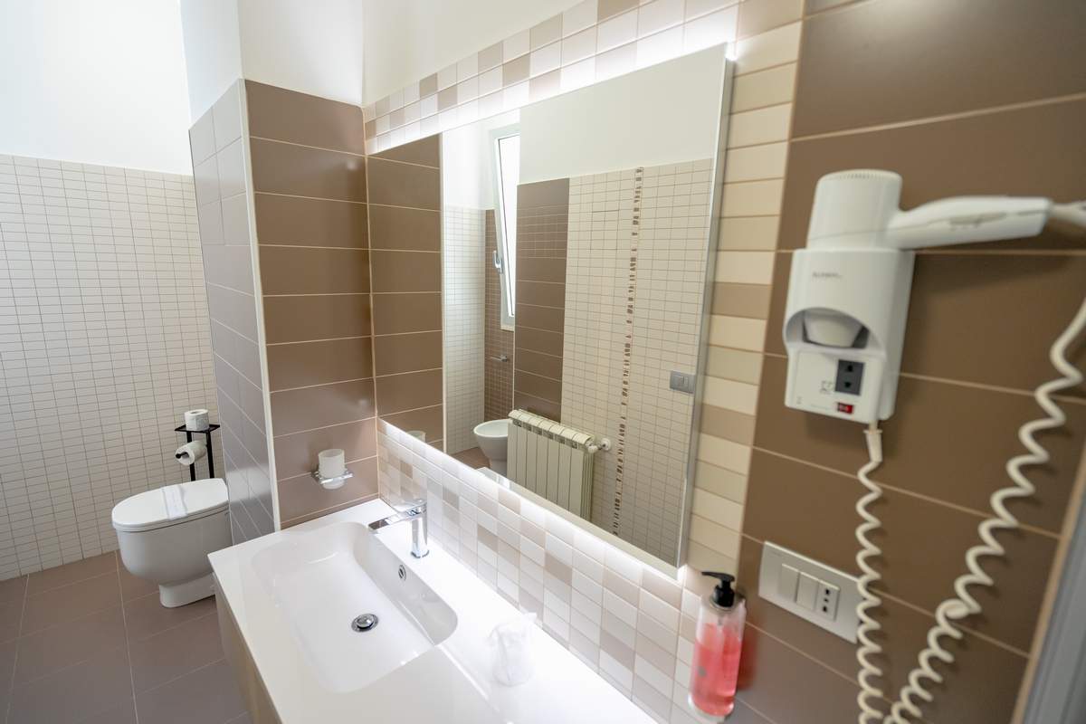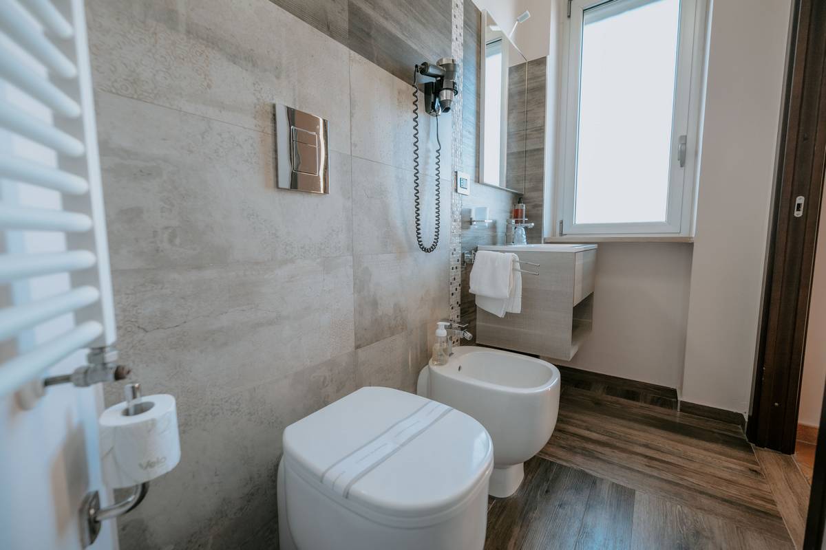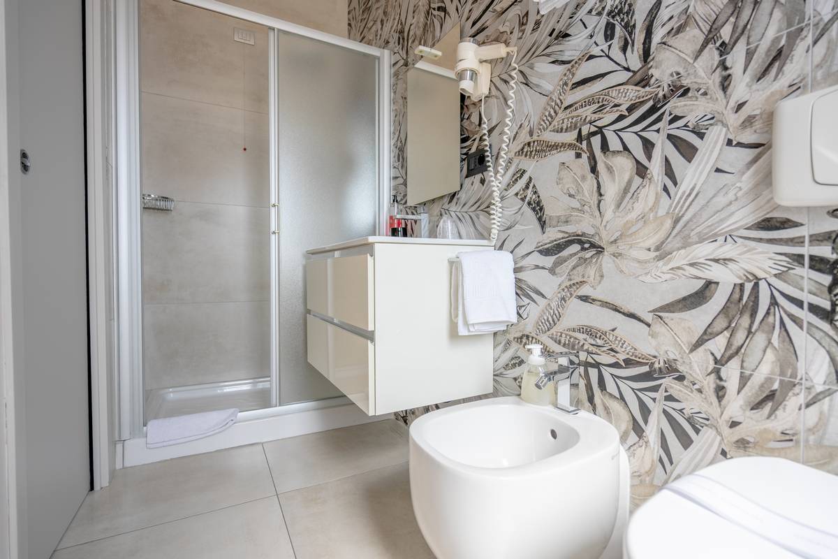 Camera con letto matrimoniale o due letti singoli (secondo disponibilità) arredata in stile moderno e bagno privato finestrato con asciugacapelli e set di cortesia.