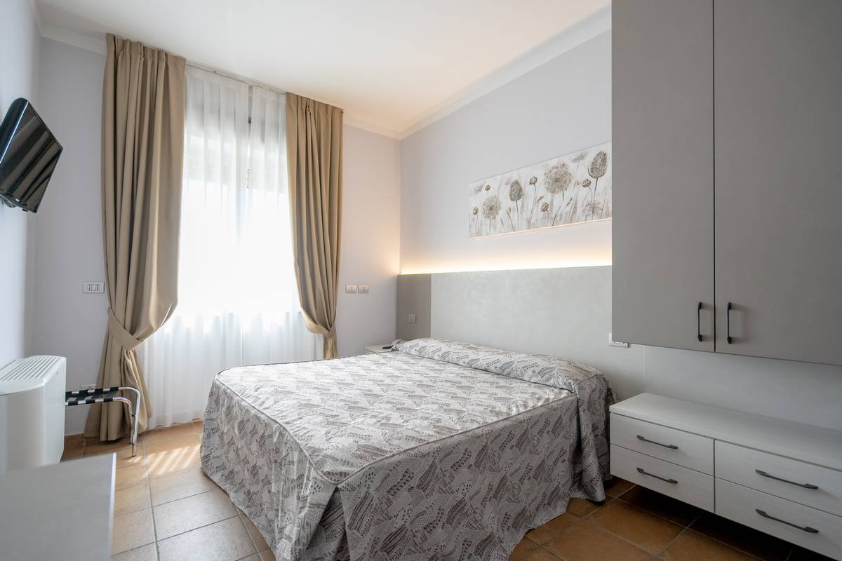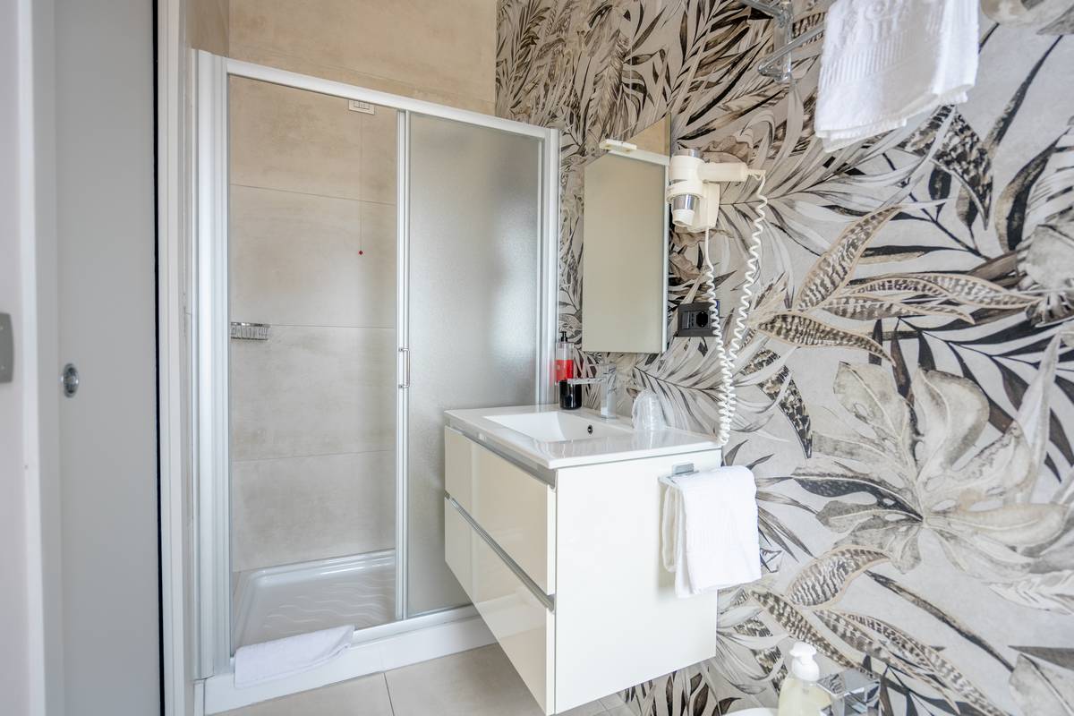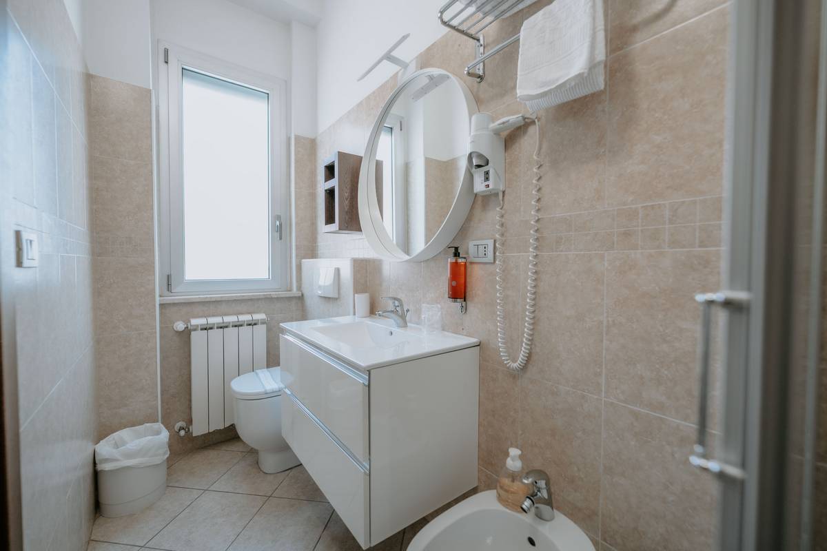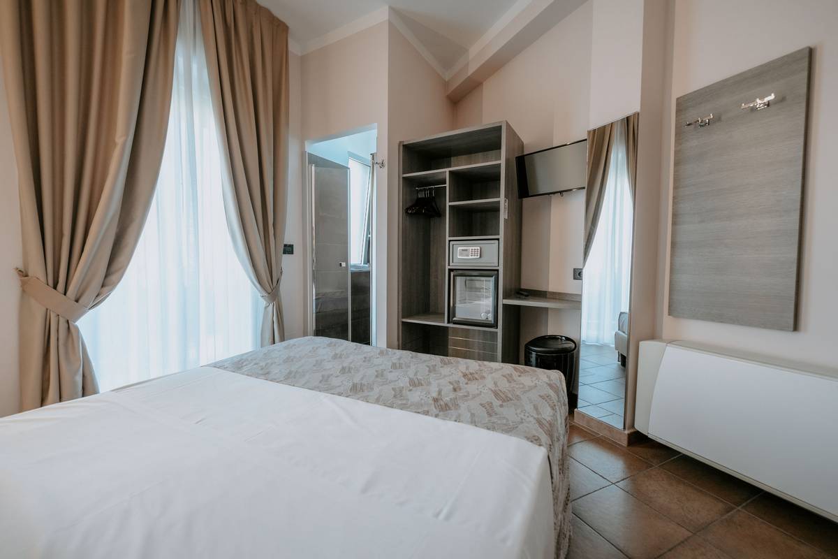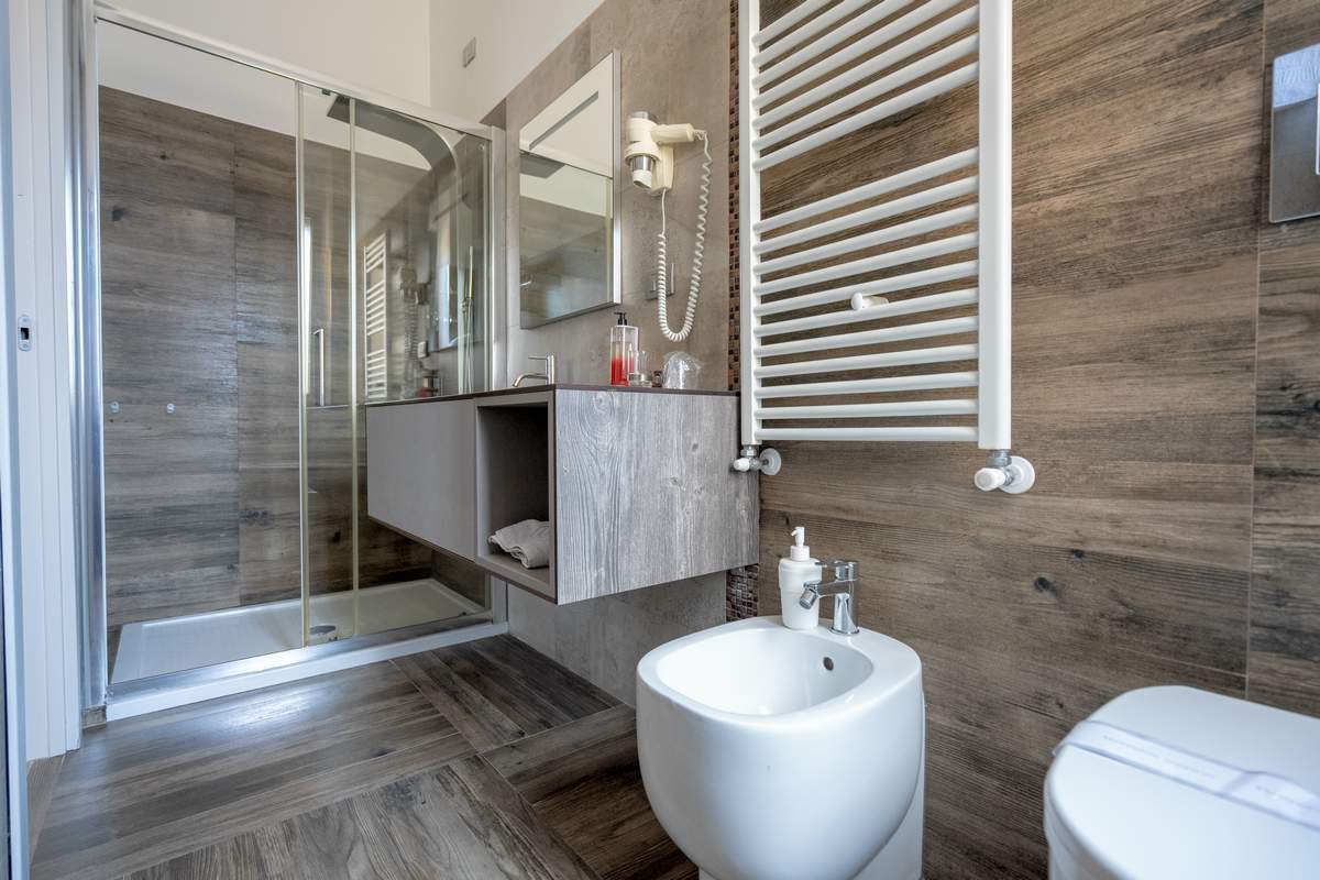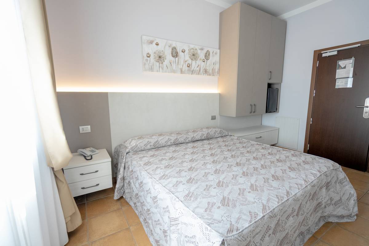 Camera con letto matrimoniale o due letti singoli (secondo disponibilità) arredata in stile moderno e bagno privato finestrato con asciugacapelli e set di cortesia.
