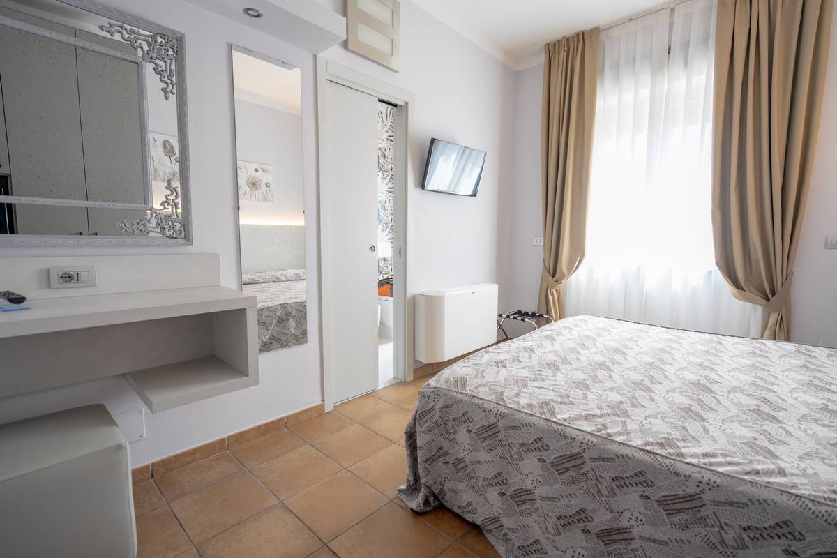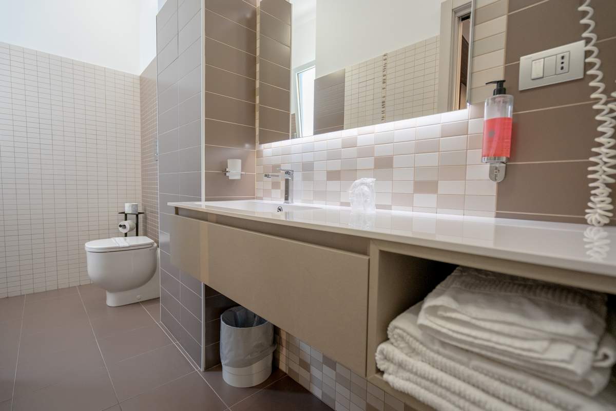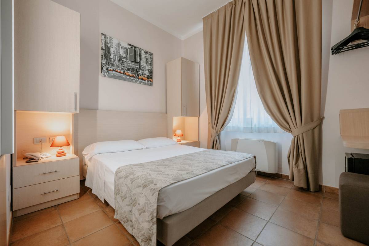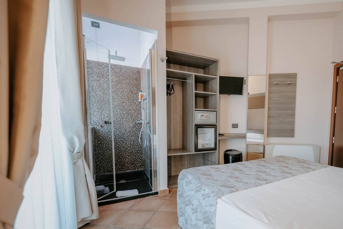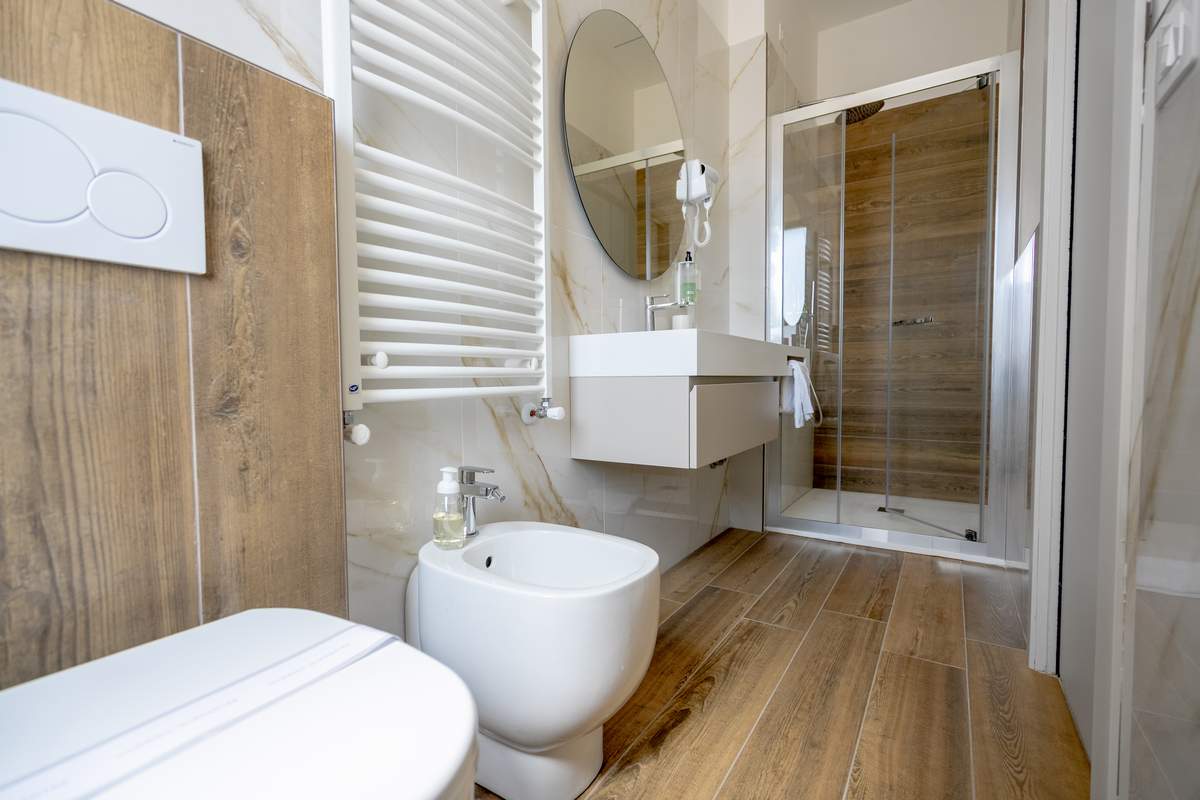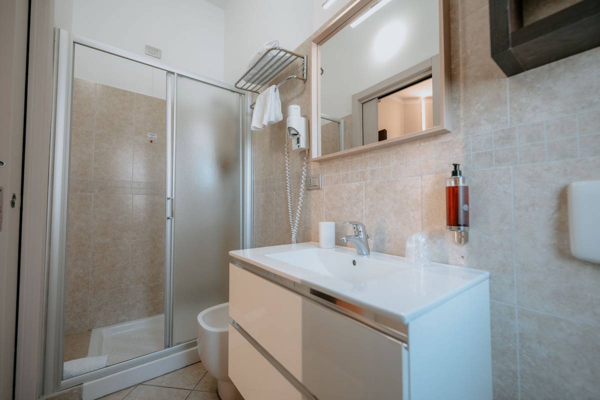 Camera con letto matrimoniale o due letti singoli (secondo disponibilità) arredata in stile moderno e bagno privato finestrato con asciugacapelli e set di cortesia.
