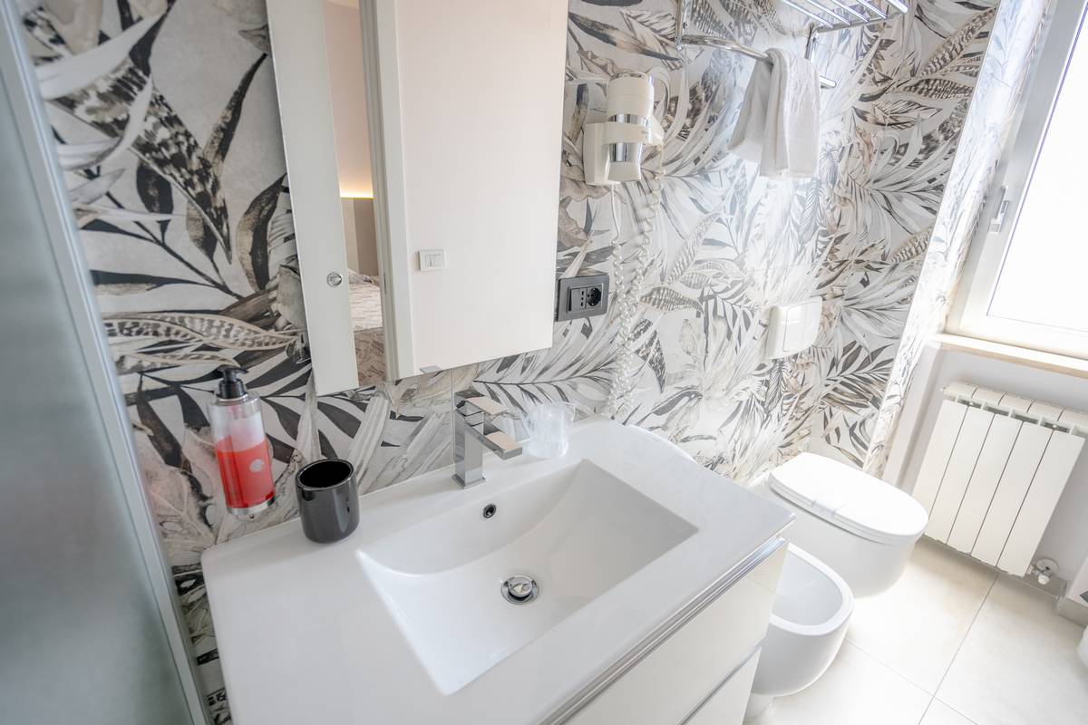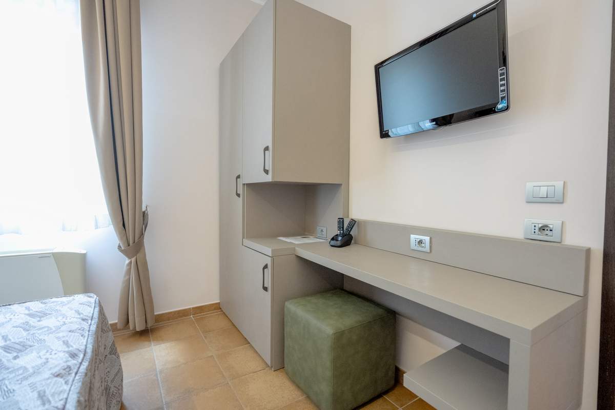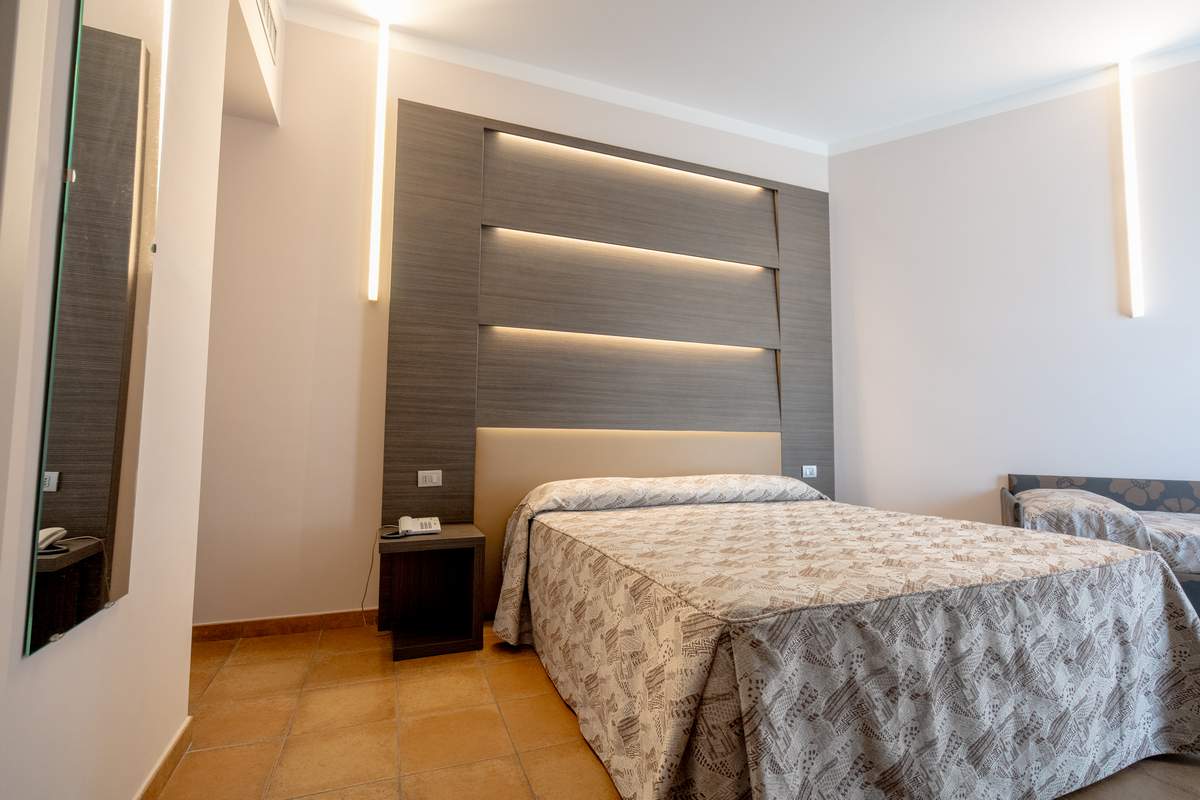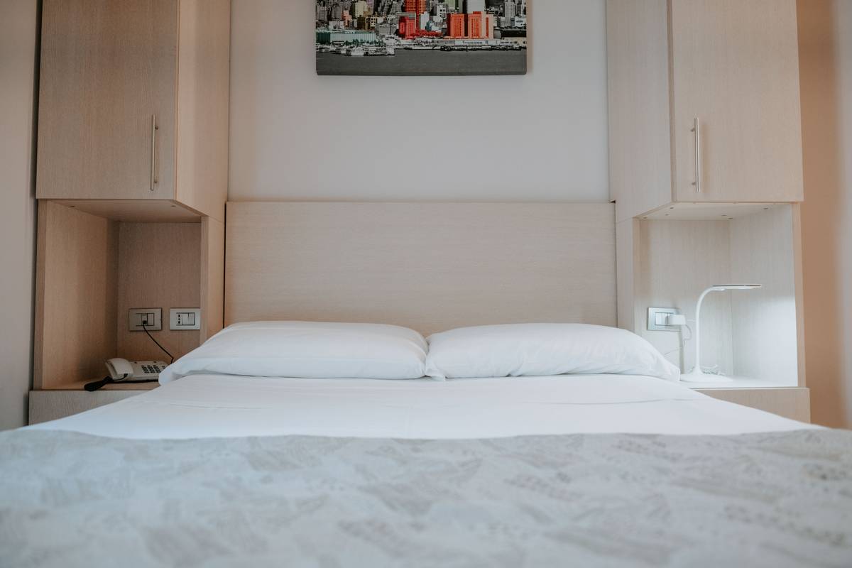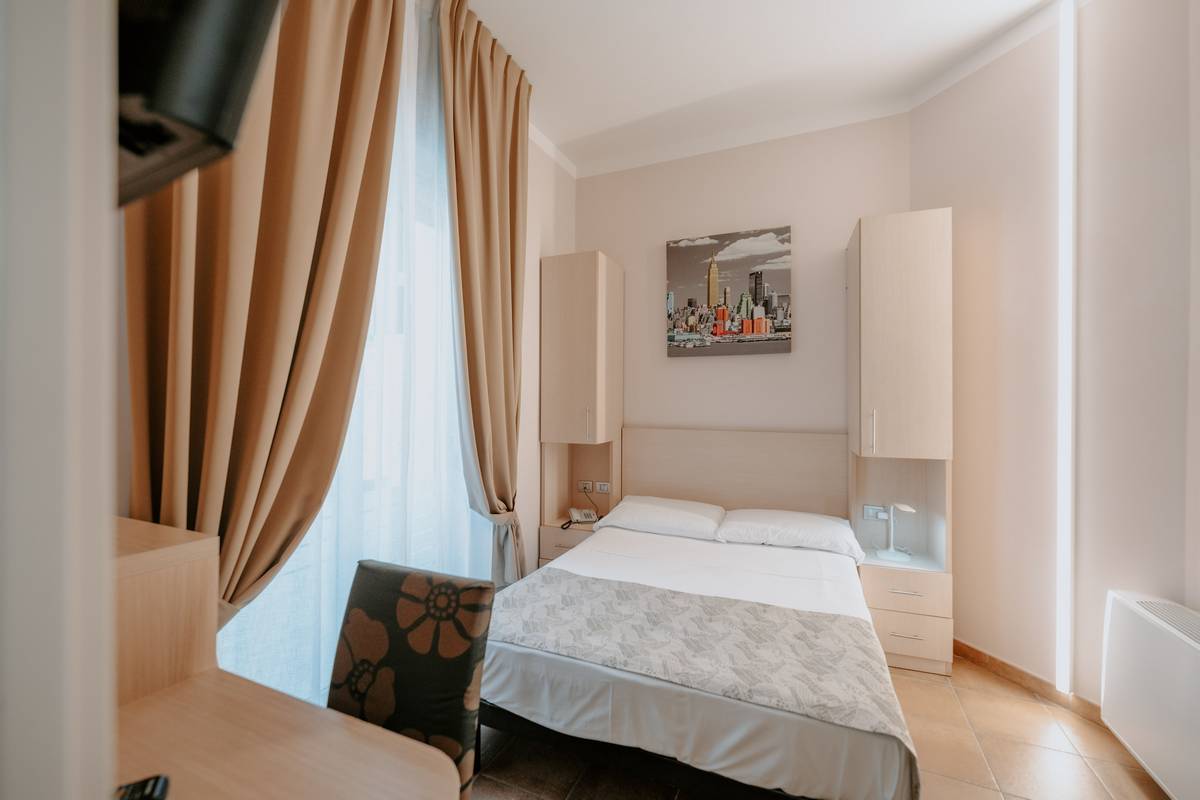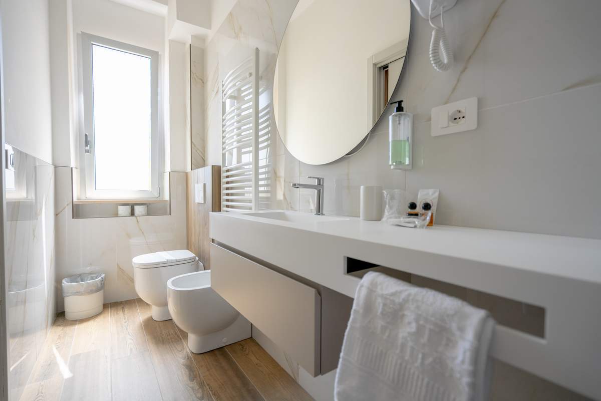 Camera con letto matrimoniale o due letti singoli (secondo disponibilità) arredata in stile moderno e bagno privato finestrato con asciugacapelli e set di cortesia.