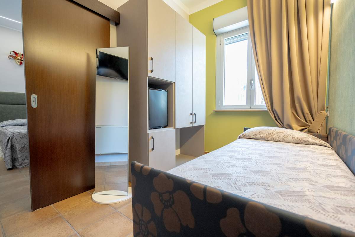 Camera completamente ristrutturata, arredata in stile moderno con cura nei piccoli dettagli: un letto matrimoniale e un letto singolo o letto a castello, e bagno privato finestrato con ampia doccia.